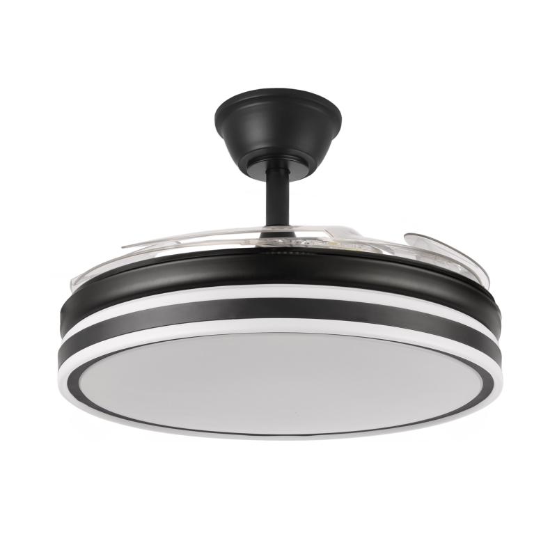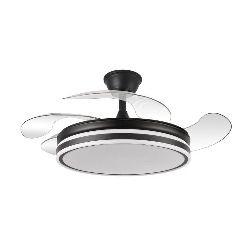 | Ventilador de Techo Bayomo Abrila - Fabrilamp | Ventilador BAYOMO realizado en metal y policarbonato, en color NEGRO con cuatro aspas DESPLEGABLES de ABS transparente muy resistentes. Motor DC. Tiene seis velocidades ajustables. Tecnología LED integrada con una potencia de 59W, con 3 TEMPERATURAS DE LUZ (3000-4000-6000K) y 6980 lúmenes. Control de aire verano o invierno. Su medida es de 34,5/42X50X50 centímetros con las aspas plegadas y de 34,5/42X107X107 centímetros con las aspas desplegadas, con dos medidas de tija para instalarlo a diferentes alturas. Mando a distancia INCLUIDO, REGULABLE EN INTENSIDAD, con MEMORIA DE COLOR incorporada y TEMPORIZADOR 2/4 H. Modelo disponible en color Níquel, Cuero, Blanco y en color Negro. | Caracteristicas Ventilador Bayomo Fabrilamp | Materiales | - Base Motor: Metal - Aspas: Acrilicas - Difusor inferior: Policarbonato | | Tonalidad de Metal | Negro | Accionado mediante | Mando a distancia. | Programador de apagado | Sí. | Numero de Aspas | 4 | Tonalidad de Aspas | Transparentes | Motor Tipo | DC - Bajo Consumo | Velocidades | 6 | Consumo / Flujo aire Revoluciones / Sonoridad | - 1ª velocidad: 7w - 3378m3/hora - 160 rpm - 20 dB - 2ª velocidad: 12w - 4323m3/hora - 180 rpm - 25 dB - 3ª velocidad: 17w - 5702m3/hora - 200 rpm - 30 dB - 4ª velocidad: 22w - 6898m3/hora - 220 rpm - 35 dB - 5ª velocidad: 27w - 7963m3/hora - 240 rpm - 40 dB - 6ª velocidad: 32w - 8958m3/hora - 260 rpm - 45 dB | Función Invierno | No | Luz | Si - Luz LED de 59w | Datos de Luz | 6980 lumenes - Regulable en intensidad | | Tonalidad de la Luz | Seleccionable (3000-4000-6000k) | Posible montaje sin Barra | No | Posible montaje en techo inclinado | No | Grafico de medidas Ventilador Bayomo Fabrilamp |