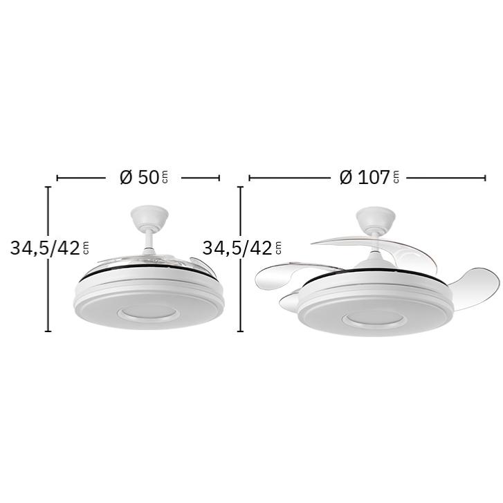Ventilador DC serie DANI realizado en metal, policarbonato, en color NIQUEL con cuatro aspas DESPLEGABLES de ABS transparente muy resistentes. Tiene seis velocidades ajustables. Motor DC. Tecnología LED integrada con una potencia de 59W, con 3 TEMPERATURAS SELECCIONABLES DE LUZ (3000-4000-6000K) luz cálida, natural y blanco frío, y 6980 lúmenes. Control de aire verano o invierno. Su medida es de 34,5/42X50 centímetros con las aspas plegadas y de 34,5/42X107 centímetros con las aspas desplegadas. Incluye dos tijas de 12,5 y 20 centímetros, para instalar a distintas alturas. Mando a distancia INCLUIDO, REGULABLE EN INTENSIDAD, con MEMORIA DE COLOR incorporada y TEMPORIZADOR 2/4 H. Modelo disponible en color cuero, blanco, negro y níquel, además de en dos tamaños diferentes.