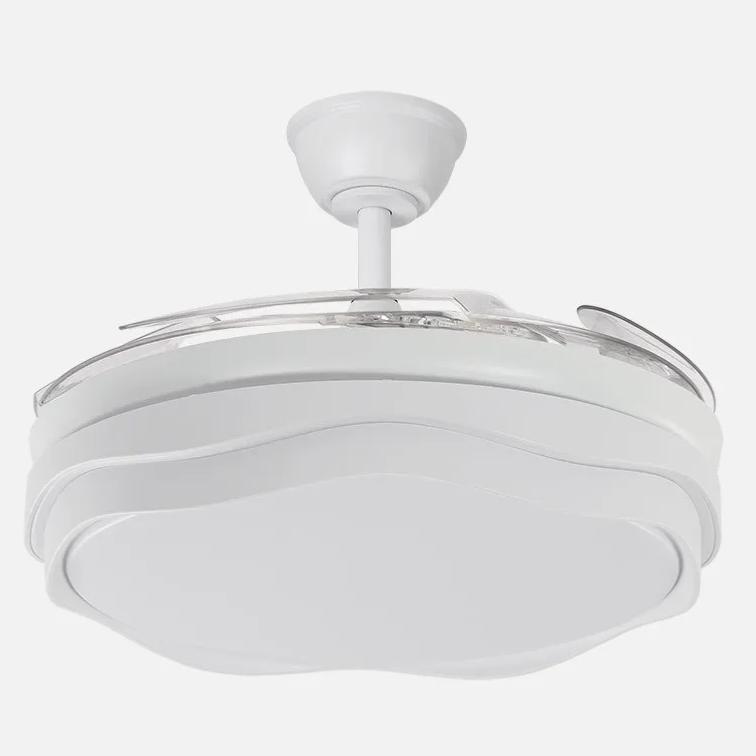 | Ventilador de la serie NASIM realizado en metal y policarbonato, en color BLANCO con cuatro aspas DESPLEGABLES de ABS transparente muy resistentes. Motor DC. Tiene seis velocidades ajustables. Tecnología LED integrada con una potencia de 59W, con 3 TEMPERATURAS DE LUZ (3000-4000-6000K) y 6980 lúmenes. Control de aire verano o invierno. Su medida es de 34,5/42X50X50 centímetros con las aspas plegadas y de 34,5/42X107X107 centímetros con las aspas desplegadas, con dos medidas de tija para instalarlo a diferentes alturas. Mando a distancia INCLUIDO, REGULABLE EN INTENSIDAD, con MEMORIA DE COLOR incorporada y TEMPORIZADOR 2/4 H. |