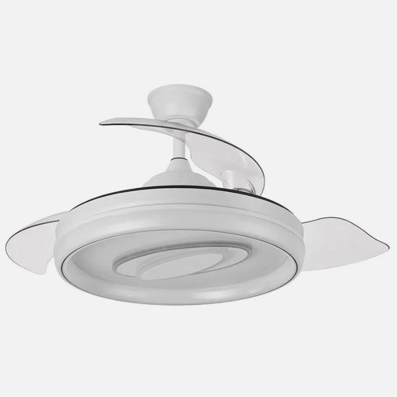 | Ventilador DC de la serie MARACANÁ realizado en metal, policarbonato y ABS, en color BLANCO con tres aspas DESPLEGABLES de ABS transparente muy resistentes. Diseño muy moderno y original, con bonito juego de luces. Tiene seis velocidades ajustables. Tecnología LED integrada con una potencia de 57W, con 3 TEMPERATURAS SELECCIONABLES DE LUZ (3000-4500-6500K) y 5980 lúmenes. Control de aire verano o invierno. Su medida es de 34,5/42X50 centímetros con las aspas plegadas y de 34,5/42X107 centímetros con las aspas desplegadas. Incluye dos tijas de 12,5 y 20 centímetros, para colocar a distintas alturas. Mando a distancia INCLUIDO, REGULABLE EN INTENSIDAD, con MEMORIA DE COLOR incorporada y TEMPORIZADOR 2/4 H. Puede utilizar el control VIA APP : FAN LAMP PRO, desde el que podrá manejar también su ventilador de manera fácil e intuitiva desde su móvil. Modelo disponible en color blanco y en negro. |