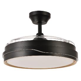 | Ventilador de Techo Tempano Fabrilamp | | Ventilador DC de la serie TEMPANO en color NEGRO/ORO con tres aspas DESPLEGABLES muy resistentes. Realizado en metal, acrílicas y policarbonato. De diseño moderno y original. Tiene seis velocidades ajustables. Tecnología LED integrada con una potencia de 72W, 7200 lúmenes y 3 TEMPERATURAS DE LUZ (3000-4500-6000K), luz cálida, luz natural y blanco frío. Control de aire verano o invierno. Su medida es de 36,5/49X49 centímetros con las aspas plegadas y de 36,5/49X107 centímetros con las aspas desplegadas, con DOS MEDIDAS DE TIJA para instalar a distintas alturas de techo. Mando a distancia INCLUIDO con MEMORIA DE COLOR y TEMPORIZADOR 1/2/4/8 H. Modelo disponible en color blanco, blanco/haya, negro/oro y negro/madera. | Características Ventilador Tempano Fabrilamp | Materiales | - Base Motor: Metal - Aspas: Acrílicas - Difusor inferior: Policarbonato | | Tonalidad de Metal | Negro | Accionado mediante | Mando a distancia. | Programador de apagado | Sí. 1, 2, y 4 horas. | Numero de Aspas | 3 | Tonalidad de Aspas | Transparentes | Motor Tipo | DC - Bajo Consumo | Velocidades | 6 | Consumo / Flujo aire Revoluciones / Sonoridad | - 1ª velocidad: 6w - 3800m3/hora - 160 rpm - 37 dB - 2ª velocidad: 8w - 4800m3/hora - 180 rpm - 38 dB - 3ª velocidad: 12w - 6000m3/hora - 200 rpm - 40 dB - 4ª velocidad: 15w - 7500m3/hora - 210 rpm - 43 dB - 5ª velocidad: 19w - 8800m3/hora - 220 rpm - 45 dB - 6ª velocidad: 30w - 9500m3/hora - 250 rpm - 47 dB | Función Invierno | Sí | Luz | Si - Luz LED de 72w. | Datos de Luz | 7200 lúmenes | | Tonalidad de la Luz | Seleccionable (3000-4500-6000k) Con Memoria | Posible montaje sin Barra | No | Posible montaje en techo inclinado | Sí* | Grafico de medidas Ventilador Tempano Fabrilamp |
