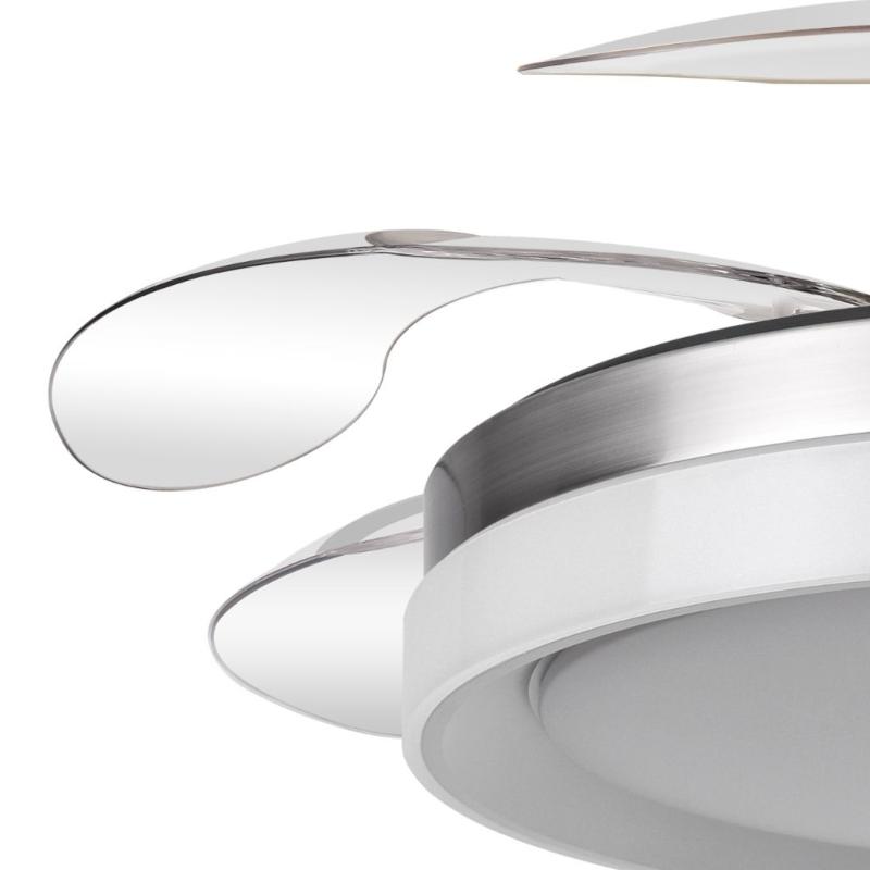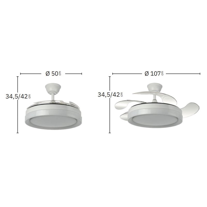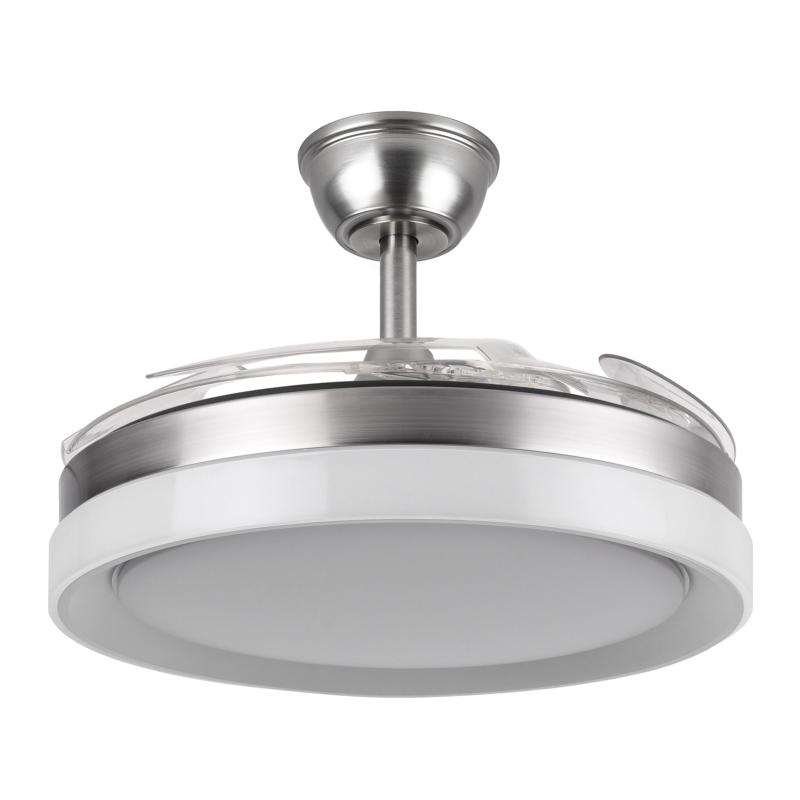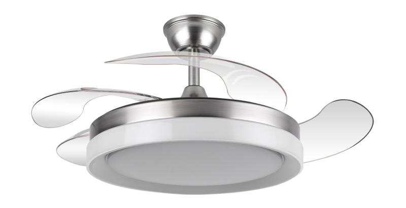 | Ventilador DC de la serie ZENIT en color NÍQUEL con cuatro aspas DESPLEGABLES muy resistentes. Realizado en metal, ABS y policarbonato, de diseño moderno, muy original y elegante. Tiene seis velocidades ajustables. Motor DC. Tecnología LED integrada con una potencia de 59W, 69800 lúmenes y 3 TEMPERATURAS SELECCIONABLES DE LUZ (3000-4000-6000K), luz cálida, luz natural y blanco frío. Control de aire verano o invierno. Su medida es de 34,5/42X50 centímetros con las aspas plegadas y de 34,5/42X107 centímetros con las aspas desplegadas, viene con DOS MEDIDAS DE TIJA para colocar a distintas alturas de techo. Mando a distancia INCLUIDO, REGULABLE EN INTENSIDAD, con MEMORIA DE COLOR y TEMPORIZADOR 2/4 H. Modelo disponible en color cuero, blanco y níquel. |
