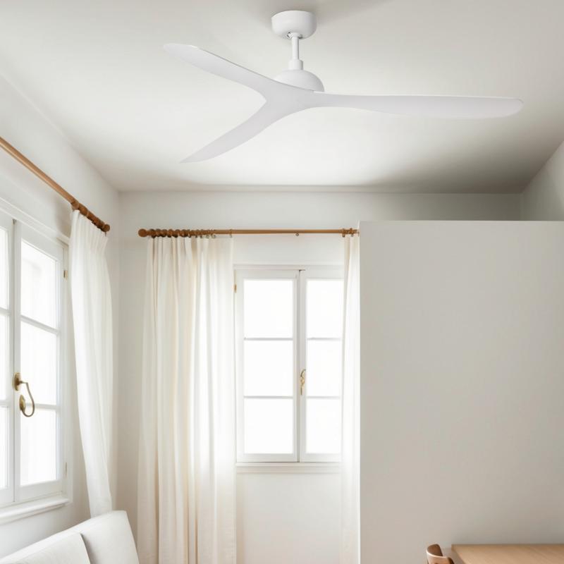| Ventilador de techo Gotland Faro | | GOTLAND es un ventilador de techo de diseño sencillo y atemporal con motor DC. Funciona accionado por mando a distancia con programador, dispone de 6 velocidades regulables, función inversa y es apto para techos inclinados. Además, disponible en tonalidad negro con aspas oscuras. | Caracteristicas Ventilador Gotland - 132 Ø | Materiales | - Base Motor: Acero - Aspas: ABS | | Tonalidad de Metal | Blanco | Accionado mediante | Mando a distancia. | Programador de apagado | Sí. 1, 4 y 8 horas | Numero de Aspas | 3 | Tonalidad de Aspas | Blanco | Motor Tipo | DC - Bajo Consumo | Velocidades | 6 | Velocidades / Consumo | 1ª velocidad: 95 rpm - 4w 2ª velocidad: 121 rpm - 6w 3ª velocidad: 148 rpm - 10w 4ª velocidad: 177 rpm - 17w 5ª velocidad: 198 rpm - 23w 6ª velocidad: 214 rpm - 30w | | Flujo de Aire | 218.9 m3 | Función Invierno | Sí | Luz | No | Posible montaje sin Barra | No | Posible montaje en techo inclinado | Si/ | Grafico de medidas Ventilador Gotland Faro | |