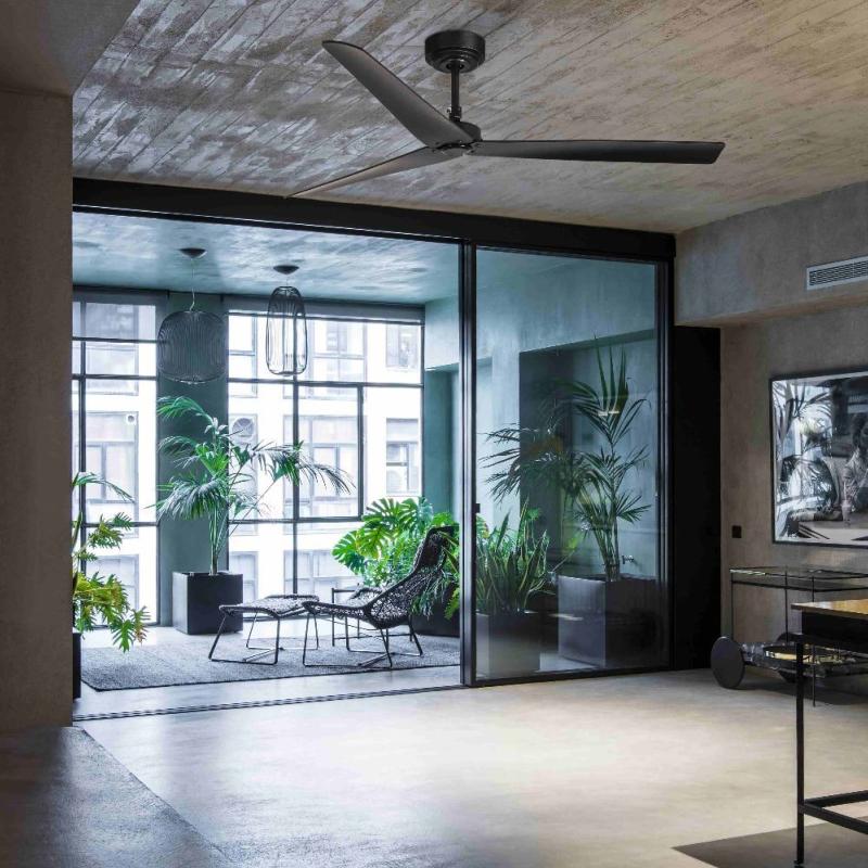 | | Ventilador de Techo Milos | MILOS es un ventilador de techo negro y largo ideal para espacios de 17,6 a 28m2. De diseño sencillo y atemporal, este ventilador con motor DC funciona accionado por mando a distancia incluido. Dispone de 6 velocidades regulables. MILOS dispone de función inversa y es apto para techo inclinado. | Características Ventilador Milos Faro | Materiales | - Base Motor: Acero - Aspas: Plywood | | Tonalidad de Metal | Negro mate | Accionado mediante | Mando a distancia. | Programador de apagado | No | Numero de Aspas | 3 | Tonalidad de Aspas | Negro mate | Motor Tipo | DC - Bajo Consumo | Velocidades | 6 | Velocidades / Consumo | - 1ª velocidad: 50 rpm - 4w - 2ª velocidad: 73 rpm - 6w - 3ª velocidad: 96 rpm - 10w - 4ª velocidad: 118 rpm - 16w - 5ª velocidad: 143 rpm - 28w - 6ª velocidad: 188 rpm - 34w | Función Invierno | Si. Activada en el mando. | Flujo de aire | 116 m3 | Luz | No | Posible montaje sin Barra | No | Posible montaje en techo inclinado | Si* | | Peso | 3.8 kg | Grafico de medidas Ventilador Milos Faro |