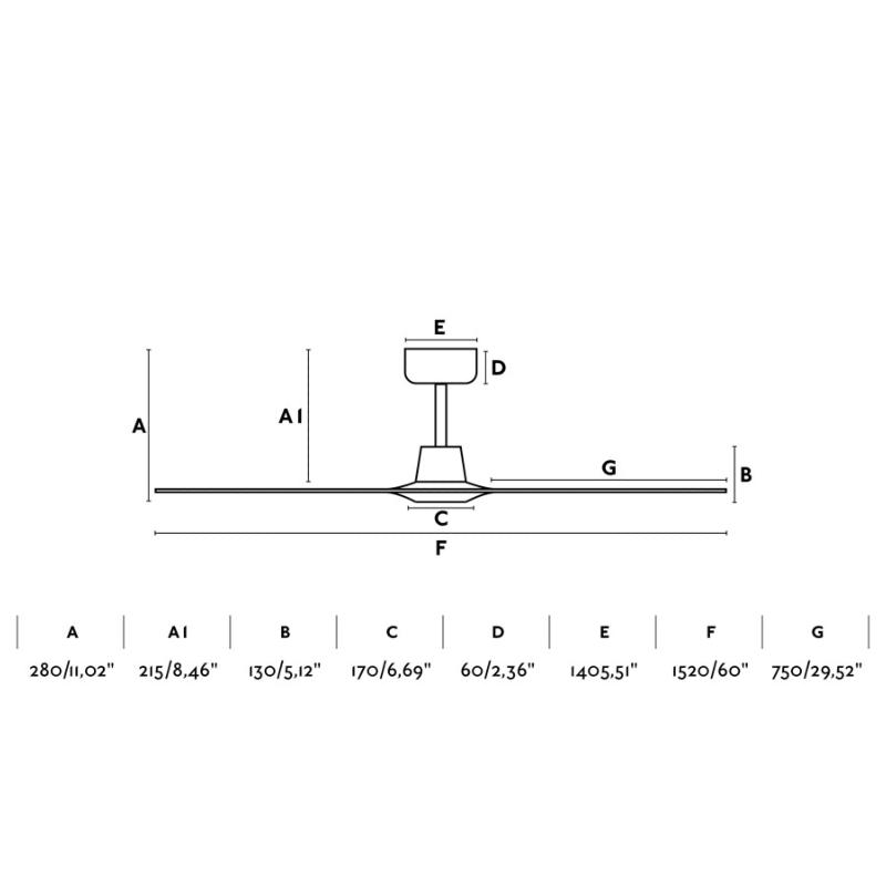 Materiales | - Base Motor: Acero - Aspas: ABS | | Tonalidad de Metal | Marrón oscuro | Accionado mediante | Mando a distancia. | Programador de apagado | Sí | Numero de Aspas | 3 | Tonalidad de Aspas | Arce | Motor Tipo | DC - Bajo Consumo | Velocidades | 5 | Velocidades / Consumo | - 1ª velocidad: 58 rpm - 3w - 2ª velocidad: 105 rpm - 7w - 3ª velocidad: 131 rpm - 12w - 4ª velocidad: 148 rpm - 17w - 5ª velocidad: 195 rpm - 38w | | Flujo de Aire | 211 m3 | Función Invierno | Sí | Luz | No | Posible montaje sin Barra | No | Posible montaje en techo inclinado | Sí* | Grafico de medidas Ventilador Morea Faro | |