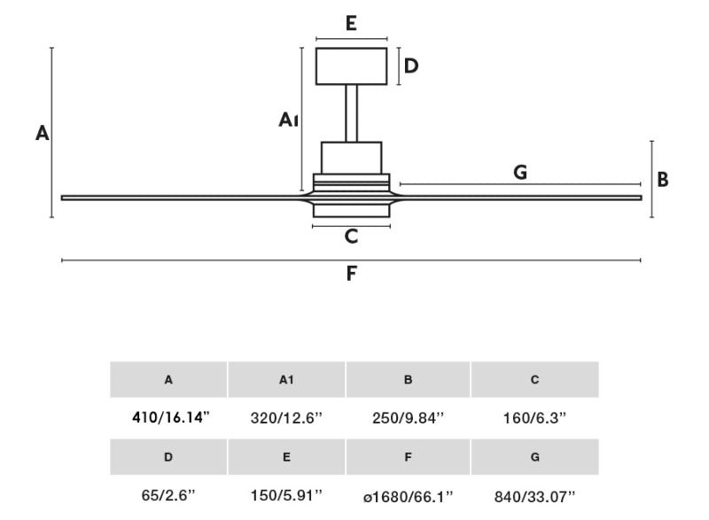 Grafico de medidas Ventilador Lantau XL con luz Faro
