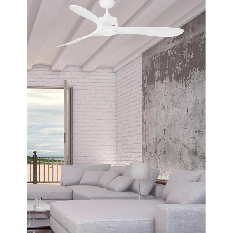 Materiales | - Base Motor: Acero - Aspas: ABS | | Tonalidad de Metal | Blanco | Accionado mediante | Mando a distancia. | Programador de apagado | Sí | Numero de Aspas | 3 | Tonalidad de Aspas | Blancas | Motor Tipo | DC - Bajo Consumo | Velocidades | 6 | Velocidades / Consumo | - 1ª velocidad: 90 rpm - 7w - 2ª velocidad: 105 rpm - 9w - 3ª velocidad: 115 rpm - 11w - 4ª velocidad: 125 rpm - 13w - 5ª velocidad: 135 rpm - 17w - 6ª velocidad: 152 rpm - 23w | | Flujo de Aire | 215 m3 | Función Invierno | Si. Activada en el mando. | Luz | No | Posible montaje sin barra | No | Posible montaje en techo inclinado | Si* | Grafico de medidas Ventilador Luzon Faro |