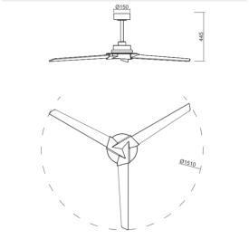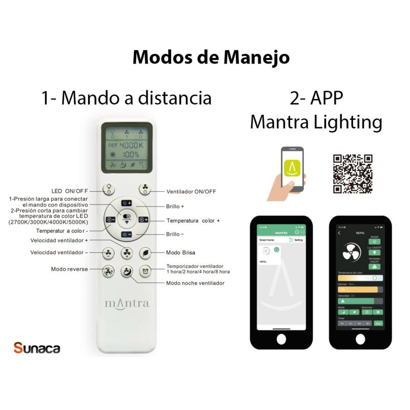 | Ventilador de Techo Brisa mini Mantra | Ventilador de techo de diseño moderno realizado en metal y aspa acrilica. Equipado con motor DC de bajo consumo de 8 velocidades + una velocidad de especial de Sleep mode, accionadas por mando a distancia y APP de Mantra. Esta lampara ventilador está equipada con luz led regulable tanto en intensidad como en tonalidad de la luz. Ventilador preparado para exteriores IP44. | Caracteristicas Ventilador Brisa mini Mantra | Materiales | - Base motor: Acrilico y metal - Aspas: - | | Tonalidad de Metal | Blancas | Accionado mediante | Mando a distancia y APP | Programador de apagado | Sí | Numero de Aspas | 3 | Tonalidad de Aspas | Blancas | Motor Tipo | DC - Corriente Continua | Velocidades | 8 + Sleep Mode | Velocidades / Consumo rpm / Flujo aire / Sonoridad | - Velocidad 1: 8w / 110 rpm / 6355m3 / 35dB - Velocidad 2: 9.5w / 120 rpm / 6930m3 / 36dB - Velocidad 3: 12w / 130 rpm / 7510m3 / 37dB - Velocidad 4: 15w / 140 rpm / 8090m3 / 38dB - Velocidad 5: 18.9w / 150 rpm / 8665m3 / 39dB - Velocidad 6: 25w / 170 rpm / 9820m3 / 42dB - Velocidad 7: 32w / 180 rpm / 10400m3 / 43dB - Velocidad 8: 40w / 195 rpm / 11270m3 / 45dB | | Flujo de Aire | 11270m3 / hora | Función Invierno | Sí. | Luz | Si - Luz LED 20w. | Lumenes | Totales 2200 - Utiles 1400 | | Tonalidad de la luz | 2700-5000k / Luz Seleccionable | Posible montaje en techo inclinado | Si * |  | Grafico de medidas Ventilador Brisa mini Mantra | |