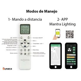 | Ventilador de Techo Thai Mantra | Ventilador de techo de diseño moderno realizado en metal y aspa acrilica. Equipado con motor DC de bajo consumo de 8 velocidades + una velocidad de especial de Sleep mode, accionadas por mando a distancia y APP de Mantra. Esta lampara ventilador está equipada con luz led regulable tanto en intensidad como en tonalidad de la luz. El ventilador thai incluye 2 barras para adaptar a la altura más idonea. | Caracteristicas Ventilador Thai Mantra | Materiales | - Base motor: Acrilico y metal - Aspas: Acrilicas | | Tonalidad de Metal | Negro | Accionado mediante | Mando a distancia | Programador de apagado | Sí | Numero de Aspas | 3 | Tonalidad de Aspas | Madera | Motor Tipo | DC - Corriente Continua | Velocidades | 8 + Sleep Mode | Velocidades / Consumo rpm / Flujo aire / Sonoridad | - Velocidad 1: 8w / 110 rpm / 2590m3 / 35dB - Velocidad 2: 10w / 120 rpm / 3240m3 / 36dB - Velocidad 3: 12w / 130 rpm / 3745m3 / 37dB - Velocidad 4: 15w / 140 rpm / 4590m3 / 39dB - Velocidad 5: 18w / 150 rpm / 5400m3 / 40dB - Velocidad 6: 25w / 170 rpm / 7200m3 / 42dB - Velocidad 7: 30w / 180 rpm / 8640m3 / 43dB - Velocidad 8: 35w / 190 rpm / 9760m3 / 45dB | | Flujo de Aire | 9760m3 / hora | Función Invierno | Sí. | Luz | Si - Luz LED 30w. | Lumenes | Totales 3300 - Utiles 2400 | | Tonalidad de la luz | 2700-5000k / Luz Seleccionable | Posible montaje en techo inclinado | Si * |  | Grafico de medidas Ventilador Thai Mantra | |