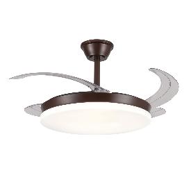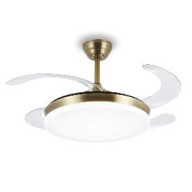 Ventilador de techo Isabella, es ideal para estancias de tamaño medio. Su motor DC es de ultima tecnología (35w muy por encima de sus competidores en el mercado), super silencioso y de bajísimo consumo. Sus 4 aspas acrílicas de formato retorcido, quedan ocultas con el ventilador apagado, dejando solo ver una lámpara de techo.