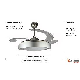 | Ventilador de Techo Málaga Sunaca | | Ventilador de techo Málaga de motor DC de bajo consumo y alto rendimiento. Super silencioso y de bajísimo consumo. Sus aspas acrílicas de formato retorcido, quedan ocultas con el ventilador apagado, dejando solo ver una lampara de techo. Con tan solo Ø48cm en posición de aspas cerradas, sus aspas de gran longitud, consiguen alcanzar los Ø112cm cuando permaneces desplegadas. Además monta 4 aspas, muy superior a los modelos con los que compite con solo 3 aspas, que necesita más vueltas por minuto para generar el mismo caudal. Dispone de mando a distancia de 6 velocidades, con programador de apagado automático. Monta iluminación mediante placa LED 2x36w sustituible, pudiendo seleccionar la tonalidad de la luz entre Fria, Neutra o Calida. Se envía con 2 barras de distinto tamaño, para adaptarlo a la altura ideal. | Caracteristicas Ventilador Málaga Sunaca | Materiales | - Base Motor: Metal - Aspas: Acrilico - Difusor inferior: Policarbonato | | Tonalidad de Metal | Niquel satinado | Accionado mediante | Mando a distancia. | Programador de apagado | Sí - 1,2 y 4 horas. | Numero de Aspas | 4 | Tonalidad de Aspas | Transparentes | Motor Tipo | DC - Bajo Consumo | Velocidades | 6 | Velocidades / Consumo | - 1ª velocidad: 165 rpm - 7w - 2ª velocidad: 185 rpm - 9w - 3ª velocidad: 202 rpm - 13w - 4ª velocidad: 225 rpm - 17w - 5ª velocidad: 239 rpm - 22w - 6ª velocidad: 251 rpm - 29w | Función Invierno | Sí. Accionada desde Mando a Distancia | Caudal de aire | 225m3 / hora | Luz | Si - Luz LED de 36x2w. | Lumenes | 3850 lúmenes | Tonalidad de la luz | Seleccionable (Luz Fria, Neutra - Semicalida) | Luminaria Incluida | Sí | Posible montaje sin Barra | No | Posible montaje en techo inclinado | Si* | Grafico de medidas Ventilador Málaga Sunaca |