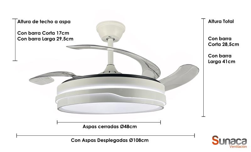 | Ventilador de Techo Marbella Sunaca | | Ventilador de techo Marbella de motor DC de bajo consumo y alto rendimiento. Super silencioso y de bajísimo consumo. Sus 4 aspas acrílicas de formato retorcido, quedan ocultas con el ventilador apagado, dejando solo ver una lampara de techo. Con tan solo Ø48cm en posición de aspas cerradas, sus aspas de gran longitud, consiguen alcanzar los Ø108cm cuando permaneces desplegadas. Además monta 4 aspas, muy superior a los modelos con los que compite con solo 3 aspas, que necesita más vueltas por minuto para generar el mismo caudal. Dispone de mando a distancia de 6 velocidades, con programador de apagado automático. Monta iluminación mediante placa LED 2x36w sustituible, pudiendo seleccionar la tonalidad de la luz entre Fria, Neutra o Calida. Luz regulable en intensidad. Se envía con 2 barras de distinto tamaño, para adaptarlo a la altura ideal. | Caracteristicas Ventilador Marbella Sunaca | Materiales | - Base Motor: Metal - Aspas: Acrilico - Difusor inferior: Policarbonato | | Tonalidad de Metal | Blanco Mate | Accionado mediante | Mando a distancia. | Programador de apagado | Sí - 1,2 y 4 horas. | Numero de Aspas | 4 | Tonalidad de Aspas | Transparentes | Motor Tipo | DC - Bajo Consumo | Velocidades | 6 | Velocidades / Consumo / Sonoridad | - 1ª velocidad: 171 rpm - 7w - 20dB - 2ª velocidad: 186 rpm - 9w - 23dB - 3ª velocidad: 202 rpm - 13w - 26dB - 4ª velocidad: 227 rpm - 17w - 29dB - 5ª velocidad: 242 rpm - 22w - 33dB - 6ª velocidad: 253 rpm - 29w - 43dB | Función Invierno | Sí. Accionada desde Mando a Distancia | Caudal de aire | 225m3 / hora | Luz | Si - Luz LED de 36x2w. | Datos de Luz | 3850 lúmenes - Luz Fria + Seleccionable 3000k-6000k | Posible montaje sin Barra | No | Luminaria Incluida | Sí | Posible montaje sin Barra | No | Posible montaje en techo inclinado | Si* | Grafico de medidas Ventilador Marbella Sunaca |