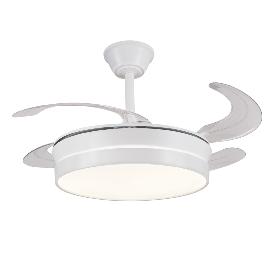 Materiales | - Base Motor: Policarbonato - Aspas: ABS - Difusor inferior: Acrílico | | Tonalidad de Metal | Blanco | Accionado mediante | Mando a distancia. | Programador de apagado | Sí. | Numero de Aspas | 4 | Tonalidad de Aspas | Transparentes | Motor Tipo | DC - Bajo Consumo | Velocidades | 6 | Velocidades / Consumo Flujo de aire / Sonoridad | - 1ª velocidad: 170 rpm - 6.2w - 3750m3/hora - 15dB - 2ª velocidad: 182 rpm - 7.3w - 4050m3/hora - 18dB - 3ª velocidad: 195 rpm - 9.5w - 4550m3/hora - 21dB - 4ª velocidad: 218 rpm - 13.6w - 5305m3/hora - 25dB - 5ª velocidad: 245 rpm - 18.2w - 5860m3/hora - 27dB - 6ª velocidad: 265 rpm - 26.5w - 6200m3/hora - 30dB | Función Invierno | Si. Activada en el mando. | Luz | Si - Luz LED de 36w+36w. | Lúmenes | 7200 lúmenes - Regulable en intensidad | | Tonalidad de la luz | 3000 - 4000 - 6000K Seleccionable. | | Luminaria incluida | Sí | Posible montaje en techo inclinado | No | Peso | 4.5 Kg | Grafico de medidas Ventilador Fiona S P&B |