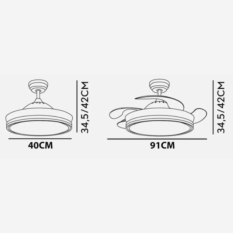 | | | Ventilador de Techo Bayomo Mini Fabrilamp - Abrila | Ventilador BAYOMO realizado en metal y policarbonato, en color BLANCO con cuatro aspas DESPLEGABLES ABS transparente muy resistentes. Motor DC. Tiene seis velocidades ajustables. Tecnología LED integrada con una potencia de 59W, con 3 TEMPERATURAS DE LUZ (3000-4000-6000K) y 6980 lúmenes. Control de aire verano o invierno. Su medida es de 34,5/42X40X40 centímetros con las aspas plegadas y de 34,5/42X91X91 centímetros con las aspas desplegadas, con dos medidas de tija para instalarlo a diferentes alturas. Mando a distancia INCLUIDO, REGULABLE EN INTENSIDAD, con MEMORIA DE COLOR incorporada y TEMPORIZADOR 2/4 H. Modelo disponible en color níquel, cuero, negro y blanco, y todos en dos medidas distintas. | Caracteristicas Ventilador Bayomo mini Fabrilamp | Materiales | - Base Motor: Metal - Aspas: ABS - Difusor inferior: Policarbonato | | Tonalidad de Metal | Blanco | Accionado mediante | Mando a distancia. | Programador de apagado | Sí. | Numero de Aspas | 4 | Tonalidad de Aspas | Transparentes | Motor Tipo | DC - Bajo Consumo | Velocidades | 6 | Consumo / Flujo aire Revoluciones / Sonoridad | - 1ª velocidad: 7w - 2702m3/hora - 170 rpm - 34.3 dB - 2ª velocidad: 12w - 3458m3/hora - 190 rpm - 35.1 dB - 3ª velocidad: 17w - 4561m3/hora - 210 rpm - 35.9 dB - 4ª velocidad: 22w - 5518m3/hora - 230 rpm - 37.2 dB - 5ª velocidad: 27w - 6370m3/hora - 250 rpm - 38.3 dB - 6ª velocidad: 32w - 7166m3/hora - 270 rpm - 40 dB | Función Invierno | Sí | Luz | Si - Luz LED de 59w. | Datos de Luz | 6980 lúmenes - regulable en intensidad | | Tonalidad de la Luz | Seleccionable (3000-4000-6000k) Con Memoria | Posible montaje sin Barra | No | Posible montaje en techo inclinado | No | Grafico de medidas Ventilador Bayomo mini Fabrilamp | |