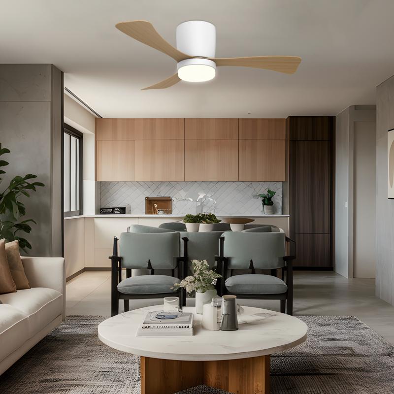 VENTILADOR KENT BLANCO MADERA 107CM 3 PALAS LED 18W es un ventilador de techo de diseño actual perteneciente a la colección KENT. Incorpora motor DC de bajo consumo, que garantiza un funcionamiento silencioso y eficiente. Dispone de varias velocidades regulables y función inversa verano/invierno para un uso durante todo el año. Incluye sistema de iluminación led. Ideal para aportar confort, eficiencia energética y estilo a cualquier estancia.