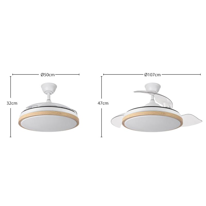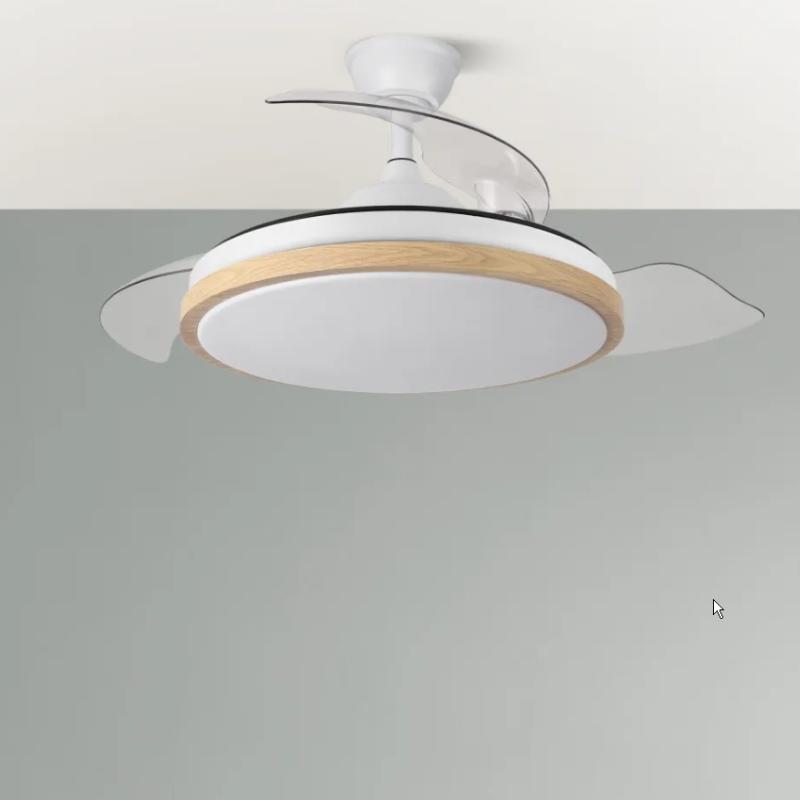 | | | Ventilador de Techo EVROS Abrila - Fabrilamp | Ventilador DC de la serie EVROS realizado en metal, policarbonato y ABS, en color blanco/haya con tres aspas DESPLEGABLES de ABS transparente muy resistentes. Tiene seis velocidades ajustables. Tecnología LED integrada con una potencia de 59W, con 3 TEMPERATURAS SELECCIONABLES DE LUZ (3000-4000-6000K) y 6980 lúmenes. Control de aire verano o invierno. Su medida es de 32/47X50 centímetros con las aspas plegadas y de 32/47X107 centímetros con las aspas desplegadas. Incluye dos tijas de 10 y 25 centímetros, para colocar a distintas alturas. Mando a distancia INCLUIDO, , REGULABLE EN INTENSIDAD, con MEMORIA DE COLOR incorporada y TEMPORIZADOR 2/4 H. Modelo disponible en blanco/haya y en negro/haya y en dos tamaños. | Caracteristicas Ventilador Evros Fabrilamp | Materiales | - Base Motor: Metal - Aspas: ABS - Difusor inferior: Policarbonato | | Tonalidad de Metal | Blanco | Accionado mediante | Mando a distancia. | Programador de apagado | Sí. | Numero de Aspas | 3 | Tonalidad de Aspas | Transparentes | Motor Tipo | DC - Bajo Consumo | Velocidades | 6 | Consumo / Flujo aire Revoluciones / Sonoridad | - 1ª velocidad: 7w - 3754m3/hora - 160 rpm - 20 dB - 2ª velocidad: 12w - 4803m3/hora - 180 rpm - 25 dB - 3ª velocidad: 17w - 6336m3/hora - 200 rpm - 30 dB - 4ª velocidad: 22w - 7665m3/hora - 220 rpm - 35 dB - 5ª velocidad: 27w - 8848m3/hora - 240 rpm - 40 dB - 6ª velocidad: 32w - 9953m3/hora - 260 rpm - 45 dB | Función Invierno | Sí | Luz | Si - Luz LED de 59w. | Datos de Luz | 6980 lúmenes - Regulable en intensidad | | Tonalidad de la Luz | Seleccionable (3000-4000-6000k) Con Memoria | Posible montaje sin Barra | No | Posible montaje en techo inclinado | No | Grafico de medidas Ventilador Evros Fabrilamp |