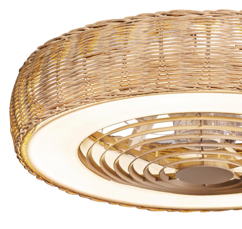 | Ventilador de Techo Kilimanjaro Mantra | | Ventilador de techo con gran luminosidad equipado con aro exterior LED con 3 tonalidades de luz a seleccionar con acabado simil a ratán. Este ventilador dispone de dos posibilidades de ensamblaje. Una posibilidad es instalar la pantalla a ras del difusor de policarbonato, y la otra posibilidad es instalar la pantalla de manera sobresaliente al difusor. | Características Ventilador Kilimanjaro Mantra | Materiales | - Base motor: Acrílico - Aspas: Acrílicas - Difusor: Policarbonato - Pantalla: Símil Ratán | | Tonalidad de Metal | Blanco | Accionado mediante | Mando a distancia | Programador de apagado | Sí | Numero de Aspas | 7 | Tonalidad de Aspas | Transparentes | Motor Tipo | DC - Corriente Continua | Velocidades | 3 | Velocidades / Consumo | - 1ª velocidad: - - 2ª velocidad: - - 3ª velocidad: 950 rpm - 35w | | Flujo de Aire | 102m3 x min | Función Invierno | Sí. | Luz | Si - Luz LED 70w. Regulable en intensidad. | Datos de Luz | 3000 lúmenes - 2700-5000k - Luz Seleccionable | Luminaria Incluida | Si | Posible montaje sin Barra | - | Posible montaje en techo inclinado | Sí | Grafico de medidas Ventilador Kilimanjaro Mantra | |