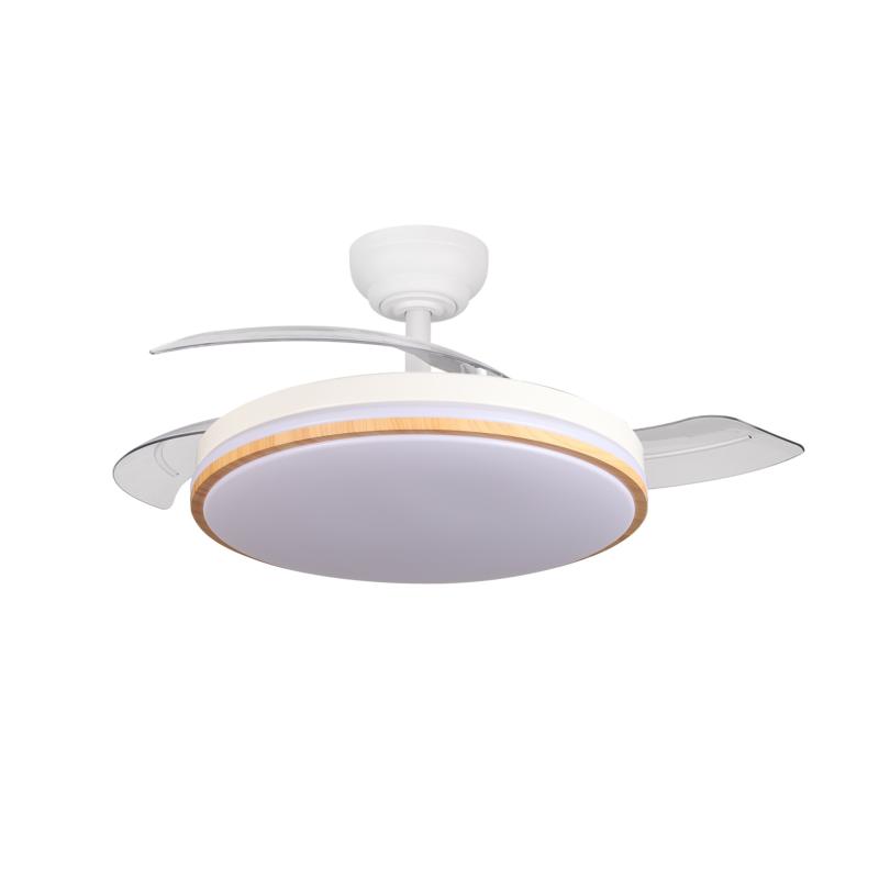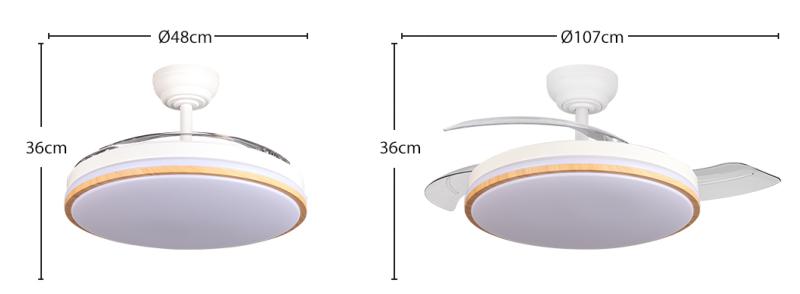 Ventilador DC de la serie RELAMPAGO realizado en metal, policarbonato y ABS, en color BLANCO y Haya con tres aspas DESPLEGABLES de ABS transparente muy resistentes. Diseño muy moderno y original. Tiene seis velocidades ajustables. Tecnología LED integrada con una potencia de 60W, con 3 TEMPERATURAS SELECCIONABLES DE LUZ (3000-4300-6500K) y 6980 lúmenes. Control de aire verano o invierno. Su medida es de 36X48X48 centímetros con las aspas plegadas y de 36X107X107 centímetros con las aspas desplegadas. Mando a distancia INCLUIDO, REGULABLE EN INTENSIDAD, con MEMORIA DE COLOR incorporada y TEMPORIZADOR 2H y 4H. Modelo disponible en color blanco y en color blanco/haya para elegir el que mejor le venga con su decoración.