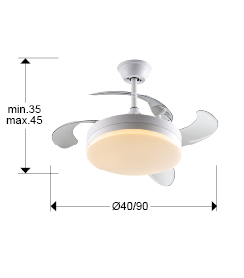 | Ventilador de Techo Mini Vento Schuller | Ventilador de techo con luz LED DIMMABLE CCT en metal acabado blanco mate y aro en blanco. Difusor opal y aspas escamoteables transparentes, en acrílico. Motor DC de 6 velocidades e inversión. Temperatura de color regulable.Temporizador. Función memo Incluye mando a distancia. 24W LED, 1.300 lm, 3.000-4000-6.000 K. Ventilador: Hélice de 4 aspas. Motor DC 35W. 6 Velocidades. (185/200/225/240/260/275 rpm). Flujo de aire (2500/3500/4000/5000/6000/7000 m3/h). Movimiento reversible. Rumor: 36 a 45Db.Movimiento reversible. Función brisa. Rumor: 36 a 43Db. Sistema de fijación antibalanceo. Incluye mando a distancia. 36W LED, 1.830 lm, 3.000-6.000 K. Ventilador: Hélice de 4 aspas, Extendidas Ø100 cm. Radio acción: Ø180 cm (medido a 140 cm debajo del ventilador). Motor DC 38W. 6 Velocidades(185/200/210/225/245/265 rpm). Flujo de aire (215/400/593/741/889/949 m3/h). Movimiento reversible. Rumor: 37 a 42Db.